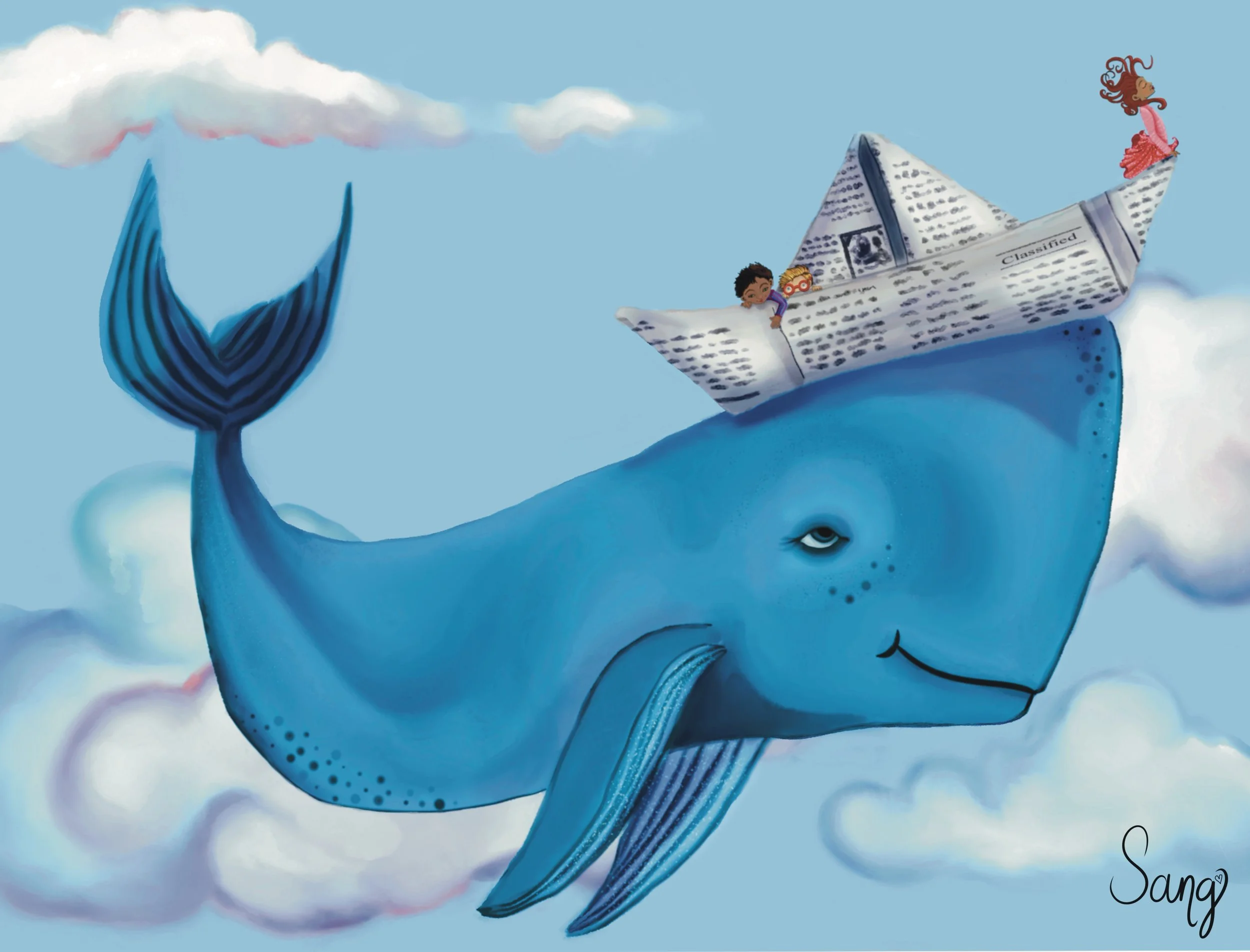 “The passengers in the art are explorers-as is the whale himself,” Sang explains. “They are all exploring together-wonder and excitement on the children’s faces, while the whale wears a knowing smile, because this is not his first adventure.”