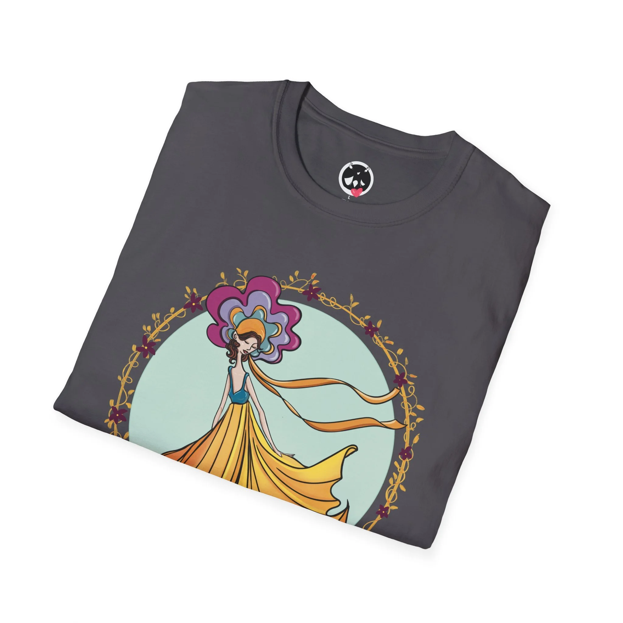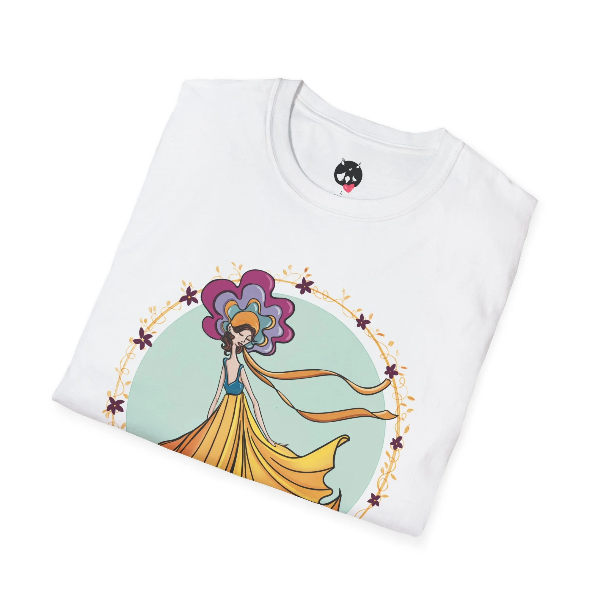 A lightweight cotton tee featuring a hand-drawn, Flower girl illustration framed by a soft circular backdrop. The artwork’s warm golds and muted teal bring a calm, sunlit energy — like a slow afternoon breeze through a sunroom. Wear it when you want something gentle and expressive: it layers easily under a cardigan, pairs with relaxed denim for market mornings, or rests against your skin during creative afternoons. The classic crew neck and clean silhouette keep the art center stage while the breathable fabric holds color and comfort through repeated wear.