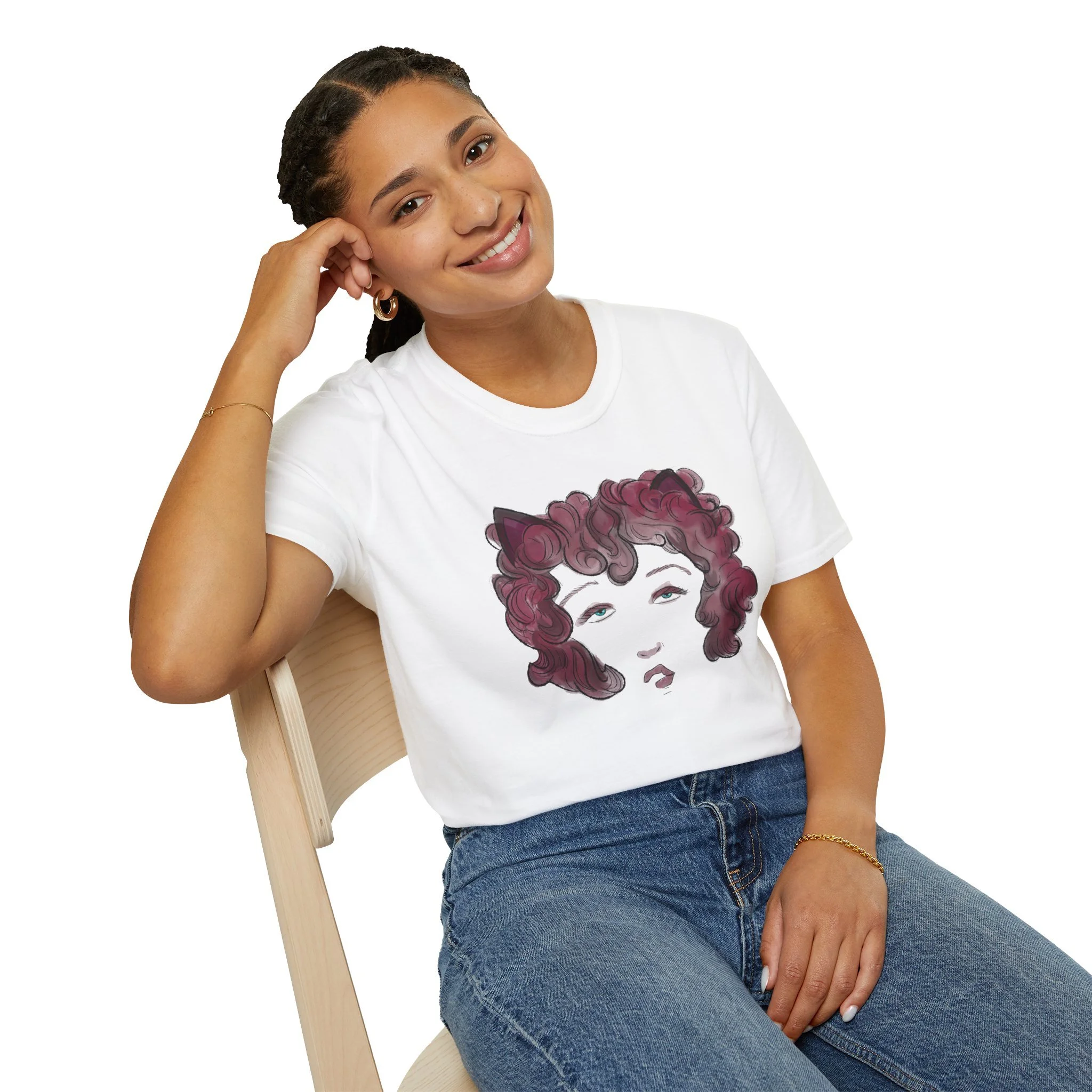 This lightweight cotton tee carries a small, expressive portrait with loose, watercolor-style curls and a quiet, thoughtful expression. It feels like the kind of shirt you reach for when you want to show subtle creativity without shouting — an everyday canvas that pairs with jeans, a blazer, or layered under a cardigan. The soft crew neck and classic fit keep the focus on the art, while the breathable fabric moves with you through gallery visits, coffee dates, or slow weekend walks. It’s an honest, wearable piece for people who love understated art and soulful style.