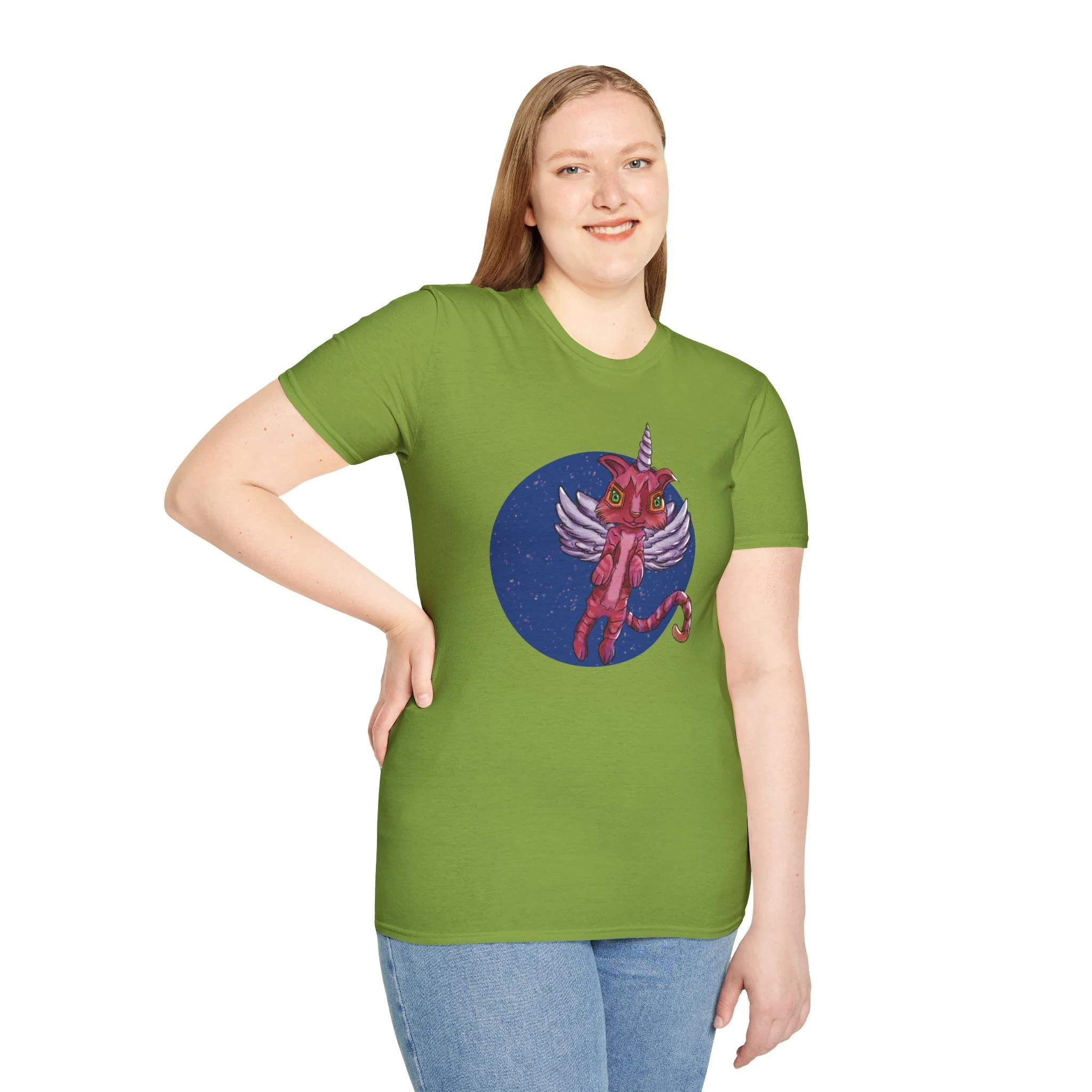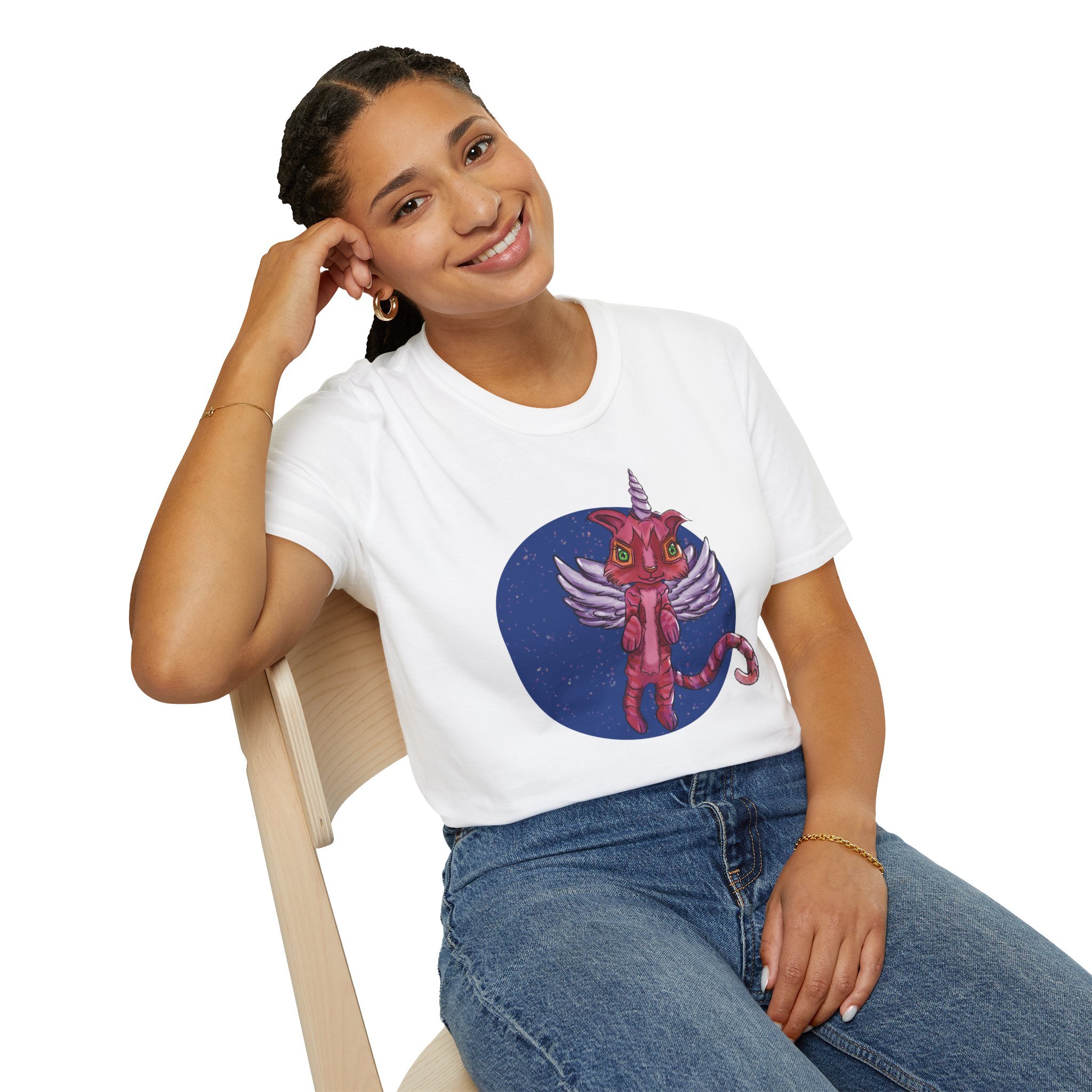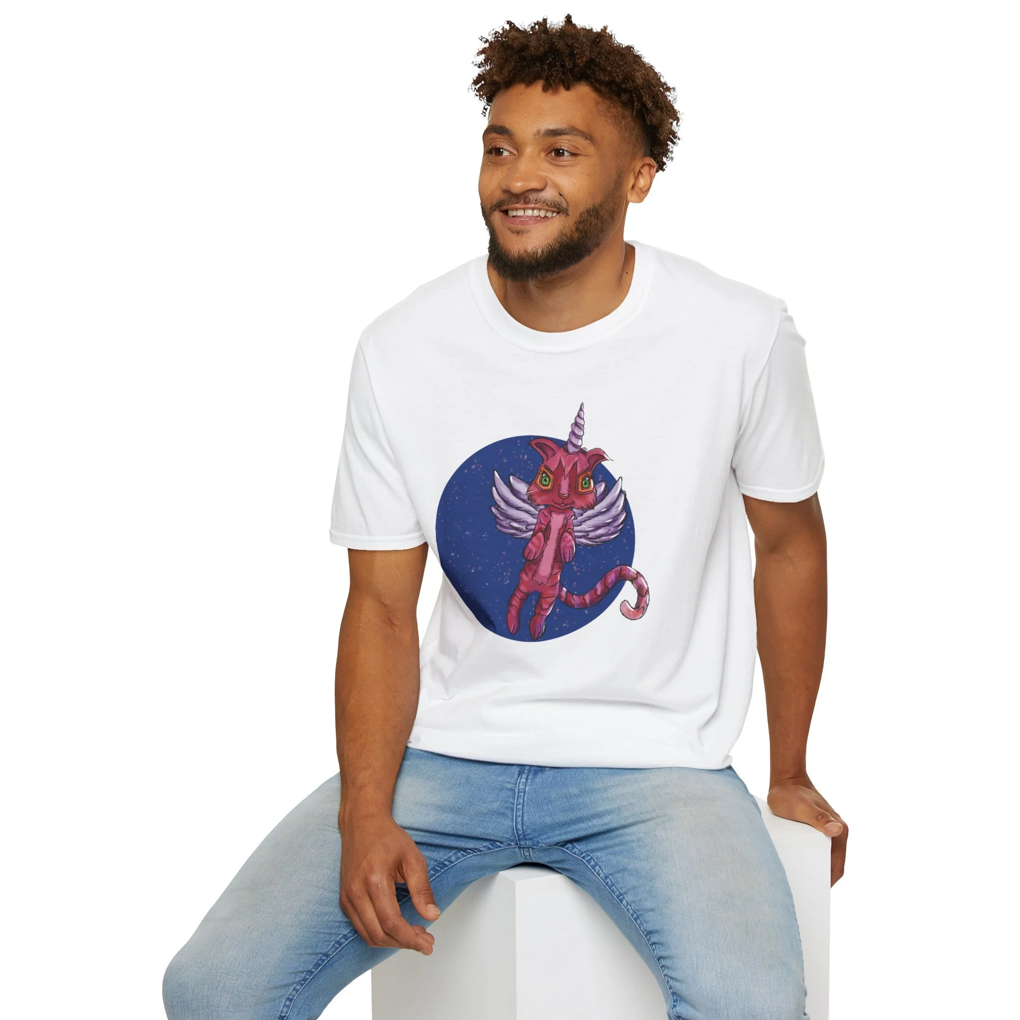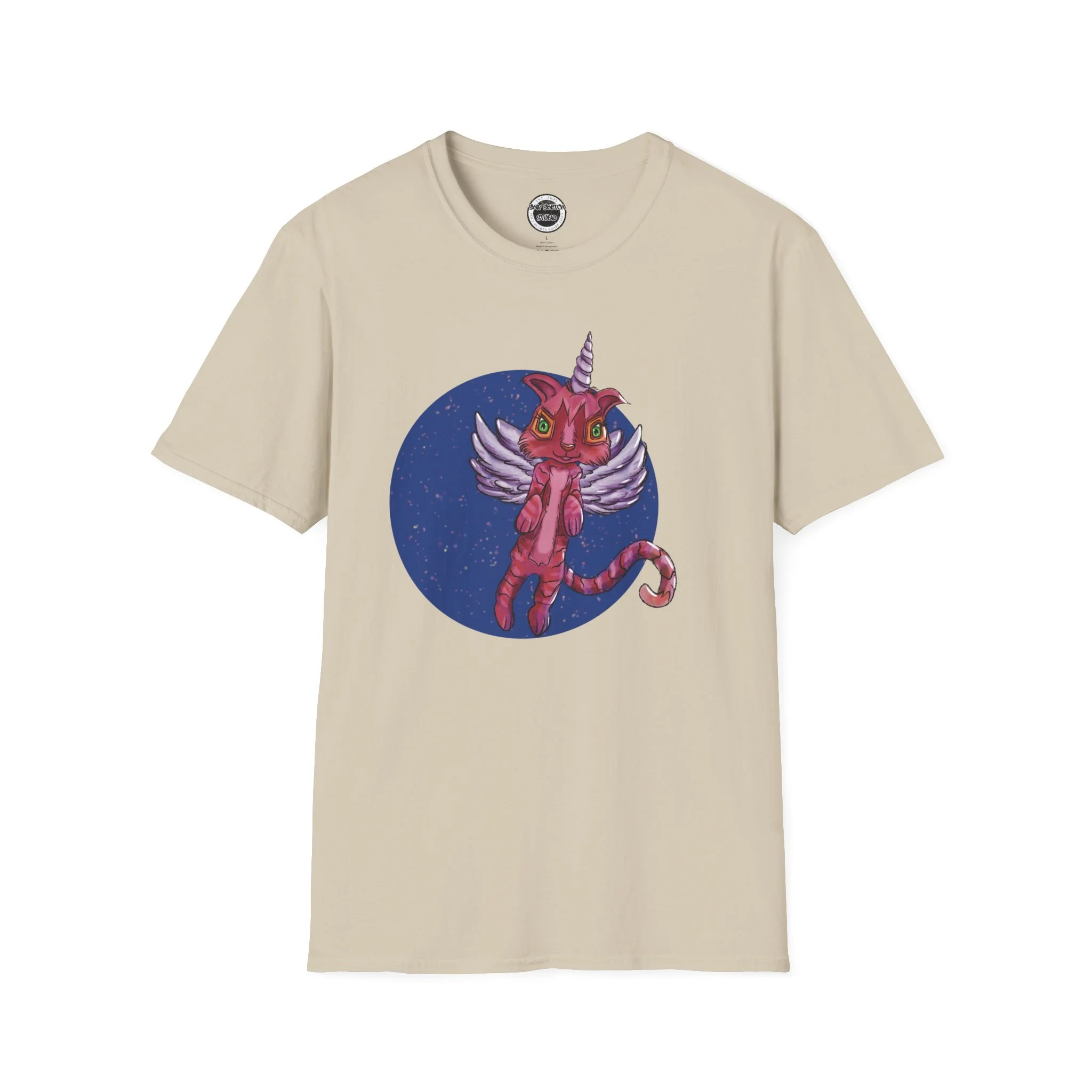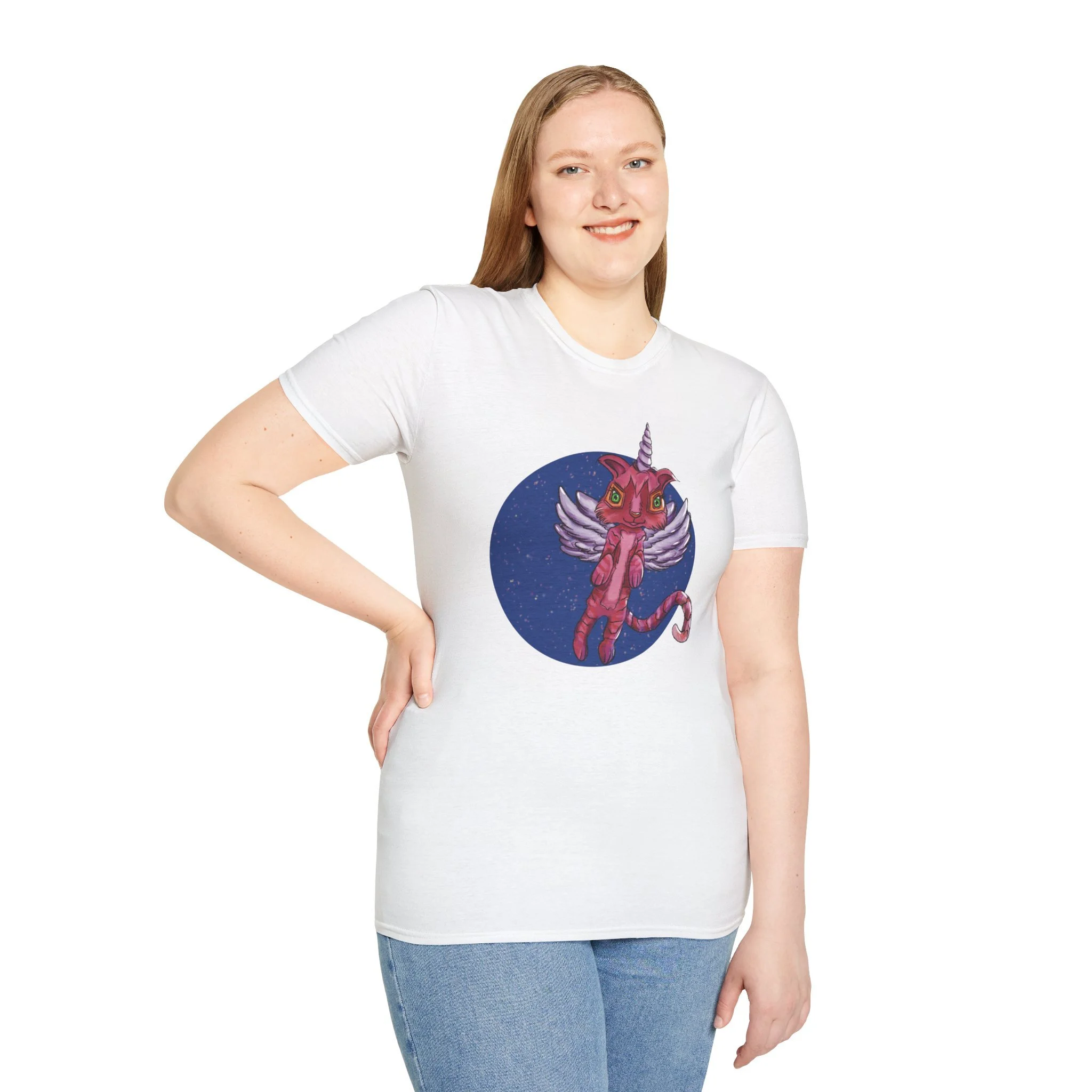 This lightweight cotton tee carries a playful, slightly surreal vibe — a pink winged cat-unicorn drifting in a midnight-blue circle. It feels like slipping into a sketchbook daydream: soft against the skin, barely there, with the print as the loud, whimsical heartbeat. Wear it when you want a little wonder in your routine: a walk under city lights, a late-night zine run, or a relaxed meet-up with friends who get the odd and imaginative. The classic crew and clean silhouette keep the look effortless while the detailed illustration does the talking. It’s casual, comfortable, and delightfully odd — made to be worn, loved, and noticed by people who collect stories and strange characters in their wardrobe.