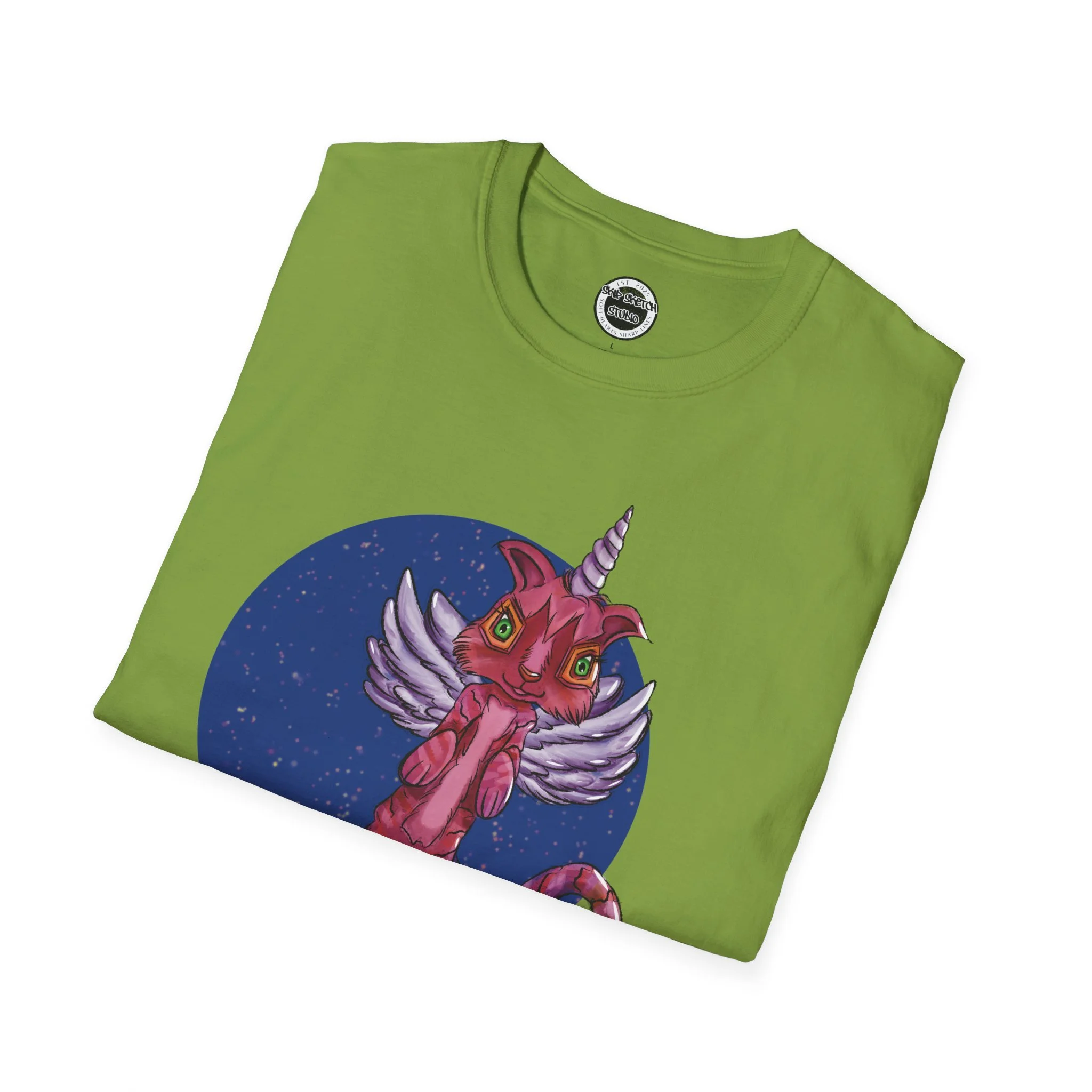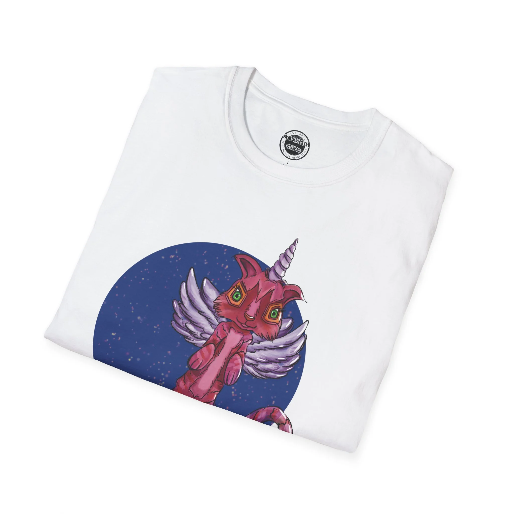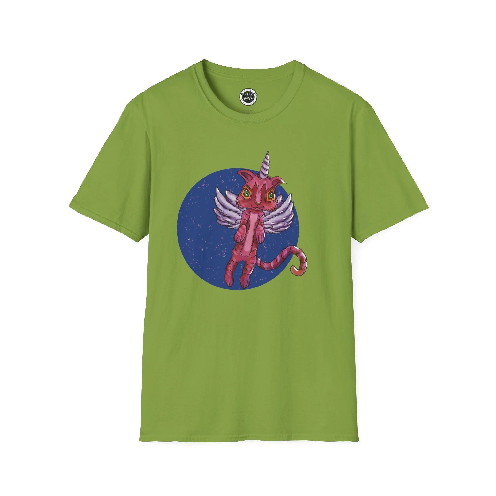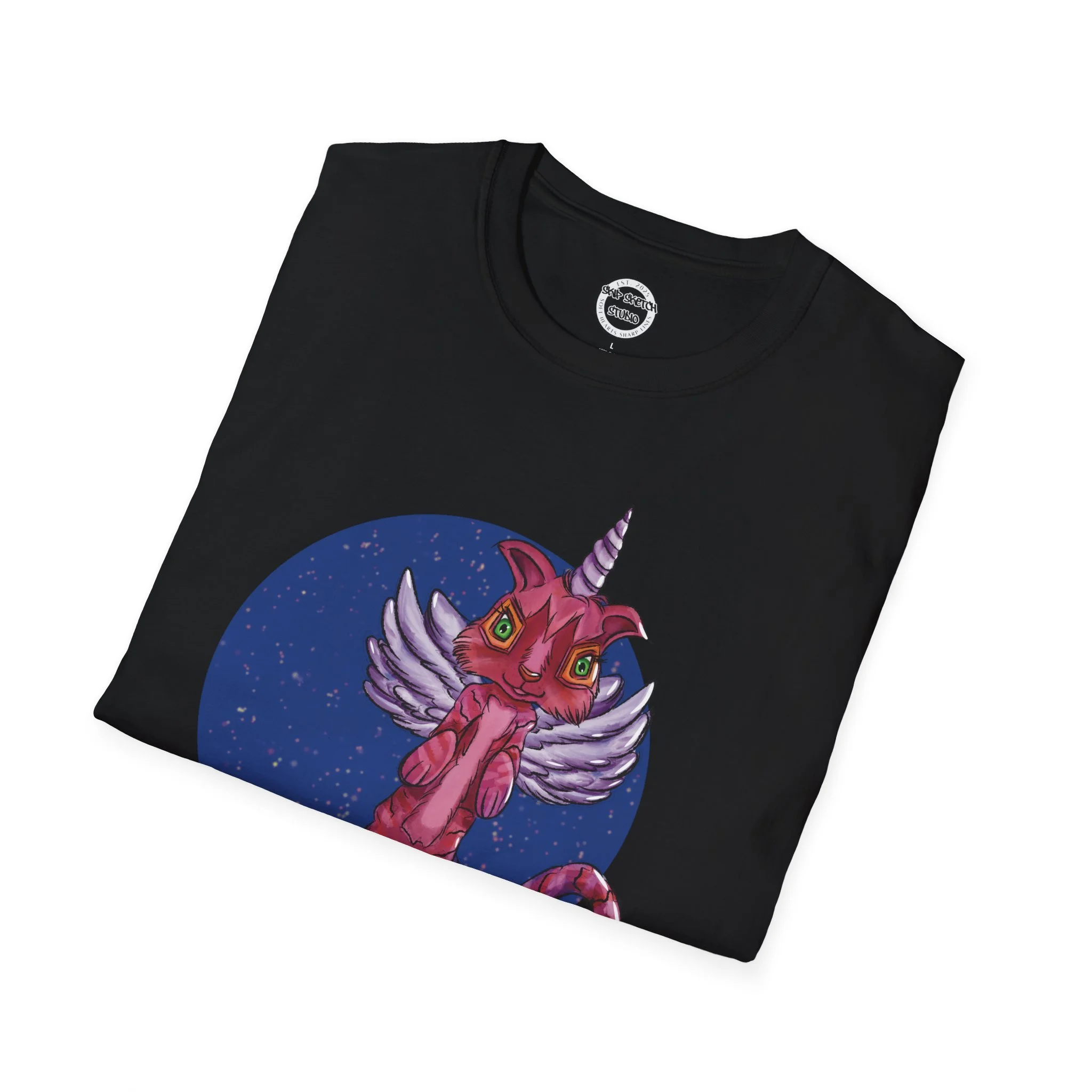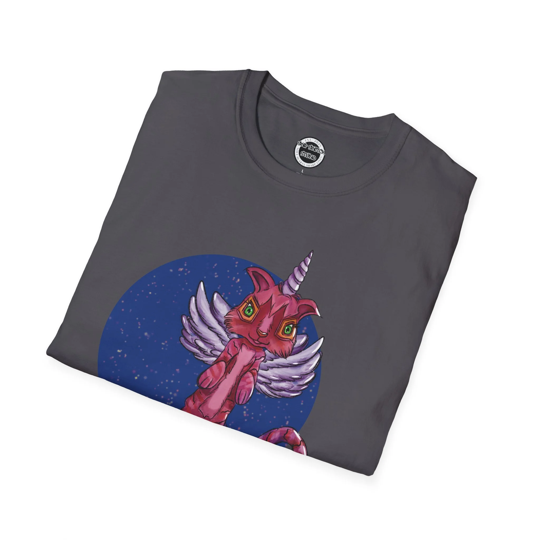 This lightweight cotton tee carries a playful, slightly surreal vibe — a pink winged cat-unicorn drifting in a midnight-blue circle. It feels like slipping into a sketchbook daydream: soft against the skin, barely there, with the print as the loud, whimsical heartbeat. Wear it when you want a little wonder in your routine: a walk under city lights, a late-night zine run, or a relaxed meet-up with friends who get the odd and imaginative. The classic crew and clean silhouette keep the look effortless while the detailed illustration does the talking. It’s casual, comfortable, and delightfully odd — made to be worn, loved, and noticed by people who collect stories and strange characters in their wardrobe.