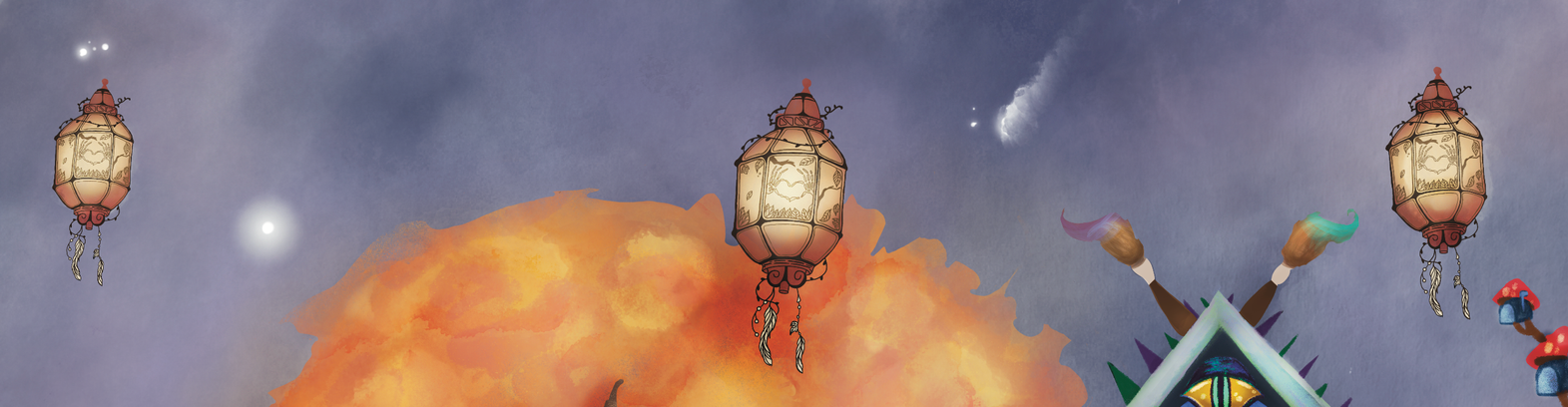 At the convergence of imagined worlds, where midnight skies are streaked with dark inks, where drifting constellations swirl into creative dust, floats a tiny but mighty island. It’s a place rushing with creative energy, and an odd place, where inks flow like water and floating lanterns bob in the winds.